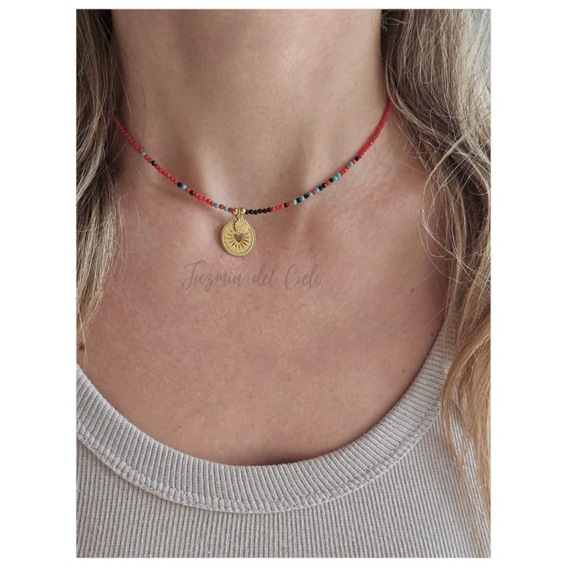 Collar en mini cristales combinados con un mini dije central en forma de circular y un mini dije acompañando dorado en acero inoxidable
