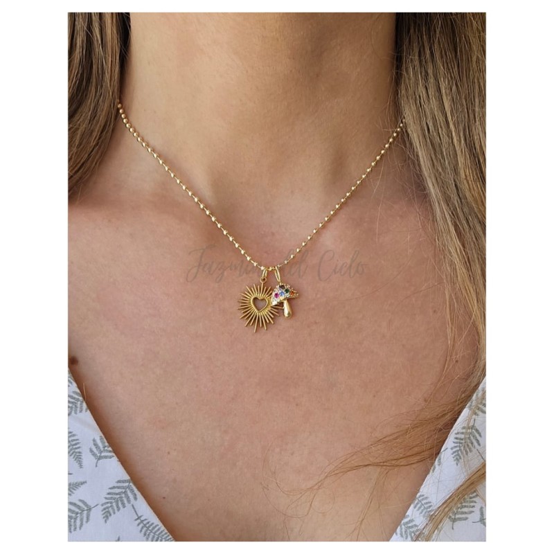 Collar elegante que presenta una delicada cadena de pelotitas enchapada en Goldfield ,que aporta un toque moderno y brillante. El colgante está compuesto por un hermoso dije en forma de hongo en Goldfield con circones de colores y junto a él, un corazón radiante de acero inoxidable.