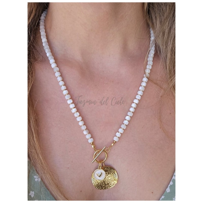 Collar en piedras naturales de nacar con separadores dorados en acero inoxidable y un cierre marino con doble dije de acero inoxidable