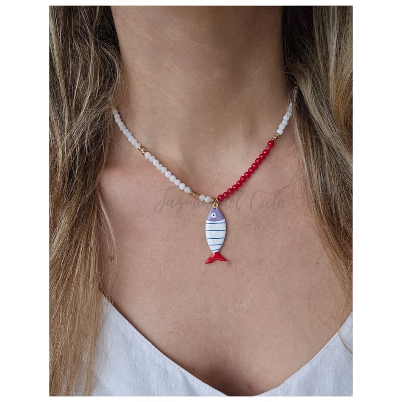 Collar en piedras naturales Moonstone combinadas con agatas rojas con separadores en Goldfield y acero inoxidable con un dije central con diseño de pez en cerámica.