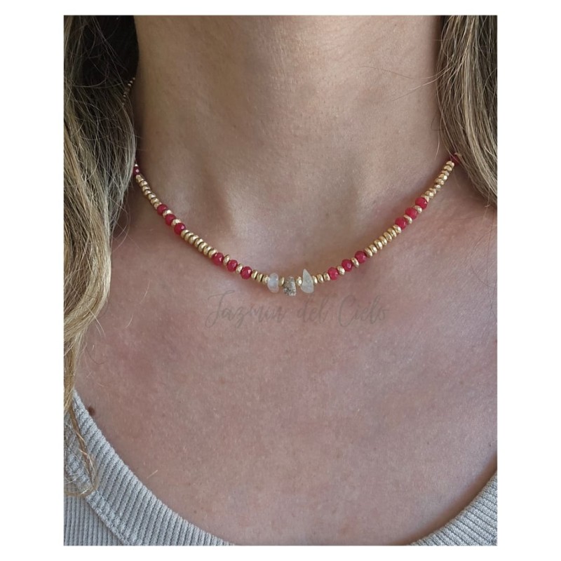 Collar en piedra facetada de hematita mate con cristales en tono rojo y piedras naturales irregulares en el centro del collar.