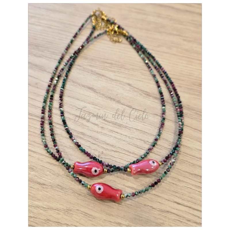 Collar en piedras naturales facetadas con un dije central en cerámica con forma de pez rojo.