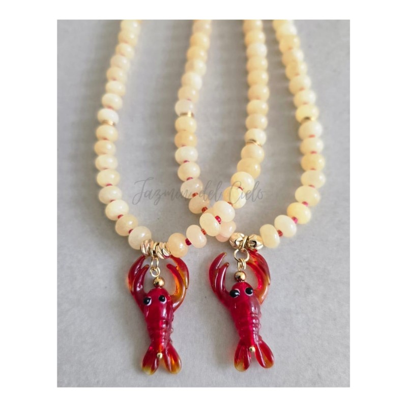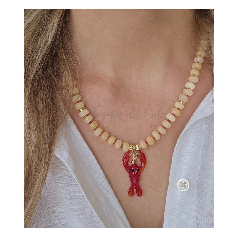 Collar en piedra Rodelle de Jade Amarillo Natural con separadores rojos y Goldfield con dije central en forma de langosta roja.