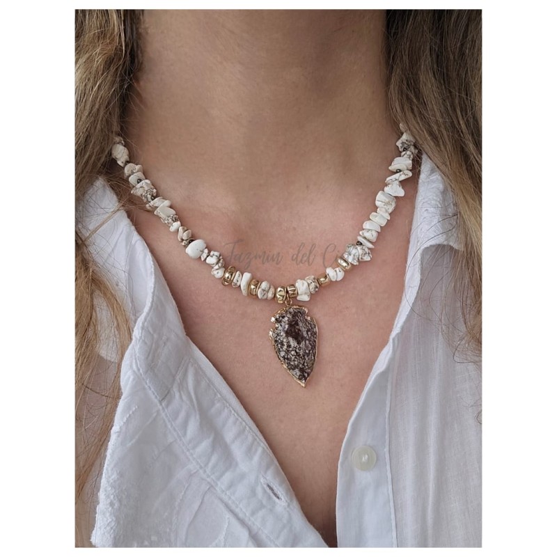 Collar en piedras naturales de Turquesa blanca con separadores dorados Goldfield y un dije central en forma de flecha en piedra natural de Jaspe.