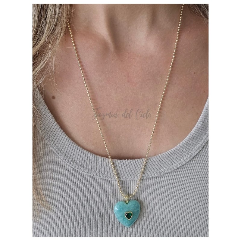 Collar de cadena de pelotitas en Goldfield dorado con un dije grande en piedra natural de cristal Aventurina en forma de corazón con un pequeño dije de circón.
