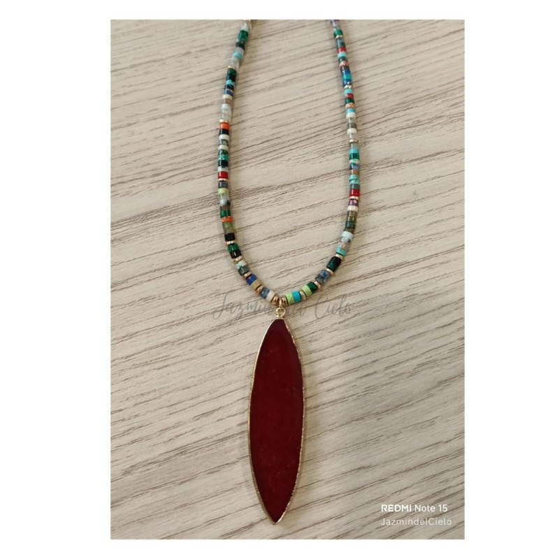 Collar en mix de piedras naturales con separadores dorados en acero inoxidable con un dije central en forma de hoja en piedra de cristal roja.