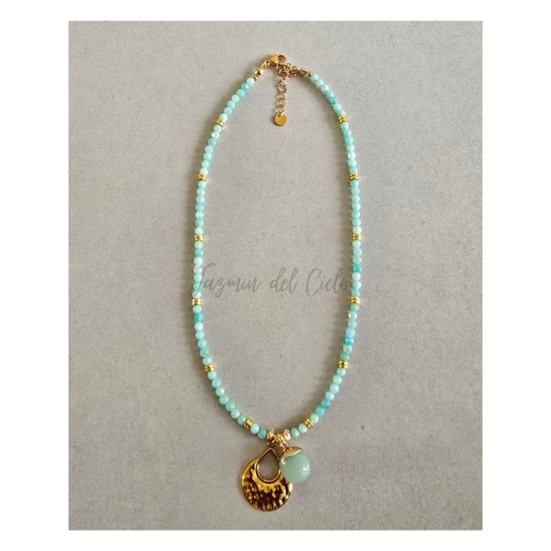 Collar vibrante compuesto por pequeñas cuentas de Amazonita en colores Rojo, Turquesa y Aguamarina. Cada collar está realzado con separadores Goldfield. En el centro, un dije dorado de acero inoxidable y otro de piedra natural al tono.