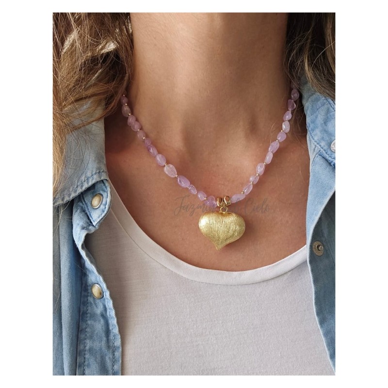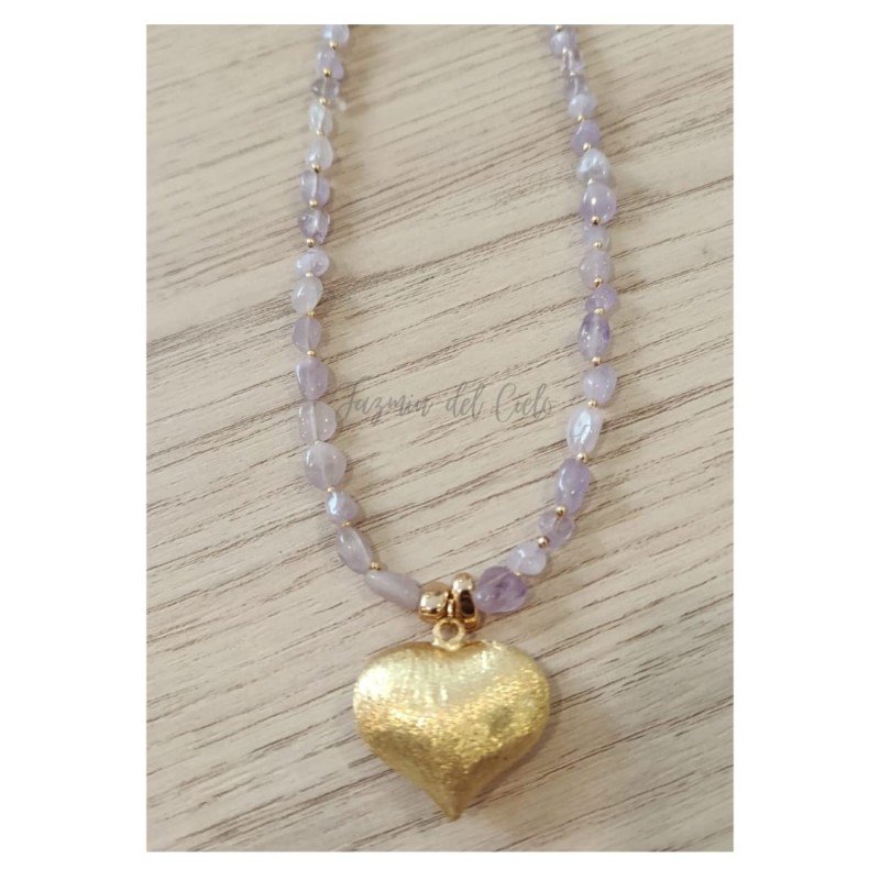 Collar de piedras naturales irregulares de Calcedonia lila con separadores dorados en Goldfield y un dije central en forma de corazón dorado poroso