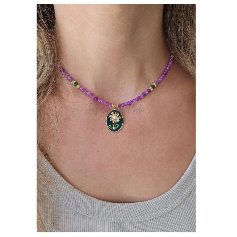 Collar en piedras naturales de Calcedonia lila combinado con cristales verdes y separadores dorados en acero inoxidable y un dije central en forma de óvalo esmaltado verde con una flor en el medio.