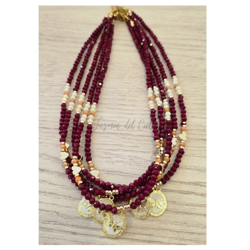 Collar de cristales facetados en tono bordó combinado con cristales facetados natural y terracota con separadores dorados y mini dijes de corazones de acero inoxidable y un dije central ovalado en acero inoxidable con esmaltado y una mariposa en el centro.