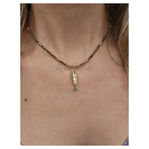 Largor total del collar: 39 cm. + 5 cm. de alargue en cadena de acero inoxidable.