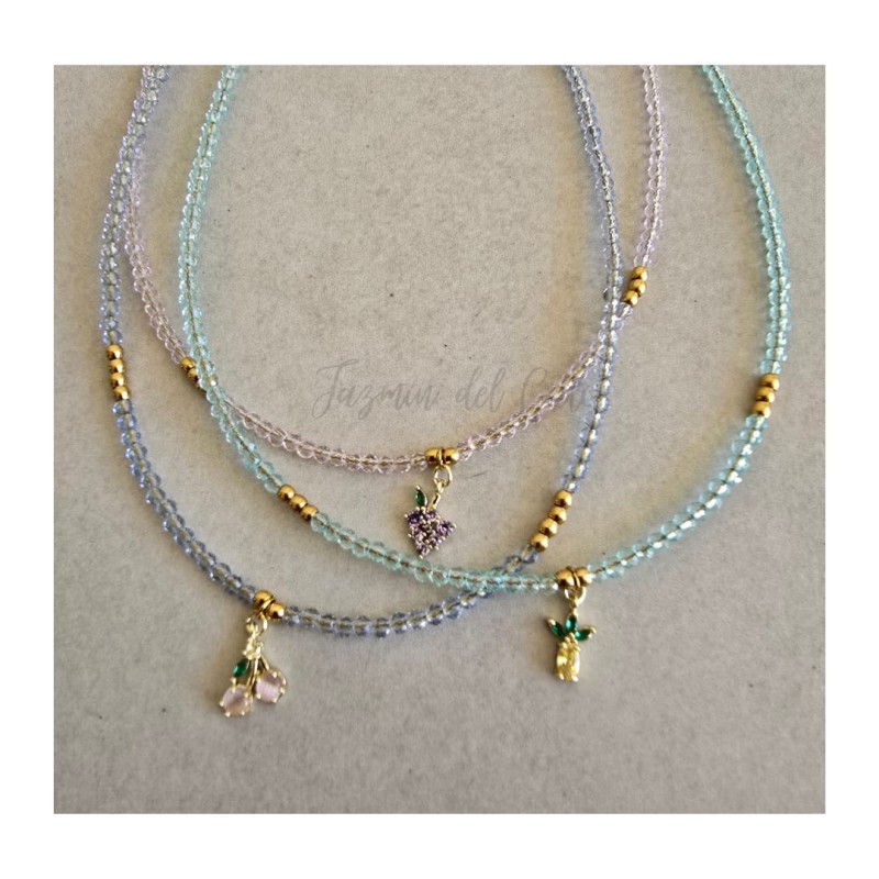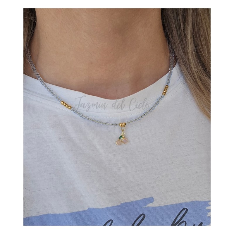 Collar de mini cristales color celeste pálido con separadores en acero inoxidable y un mini dije central de circón en forma de guinda.