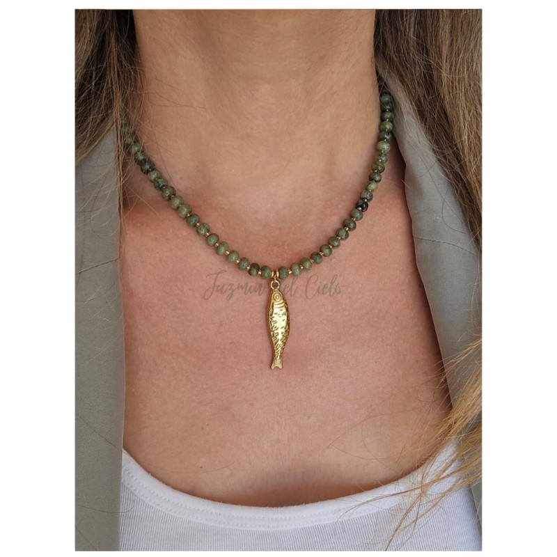 Collar en piedras naturales Rondelle en ágata verde con separadores en mostacillitas doradas con un dije central en forma de pez en acero inoxidable.