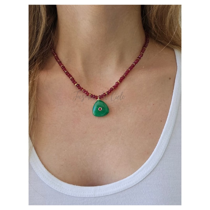 Collar en piedras naturales de Agatas facetadas tono bordó con separadores en acero inoxidable y un dije central en forma de triángulo en piedra de ágata verde con un pequeño circón central en tono bordó