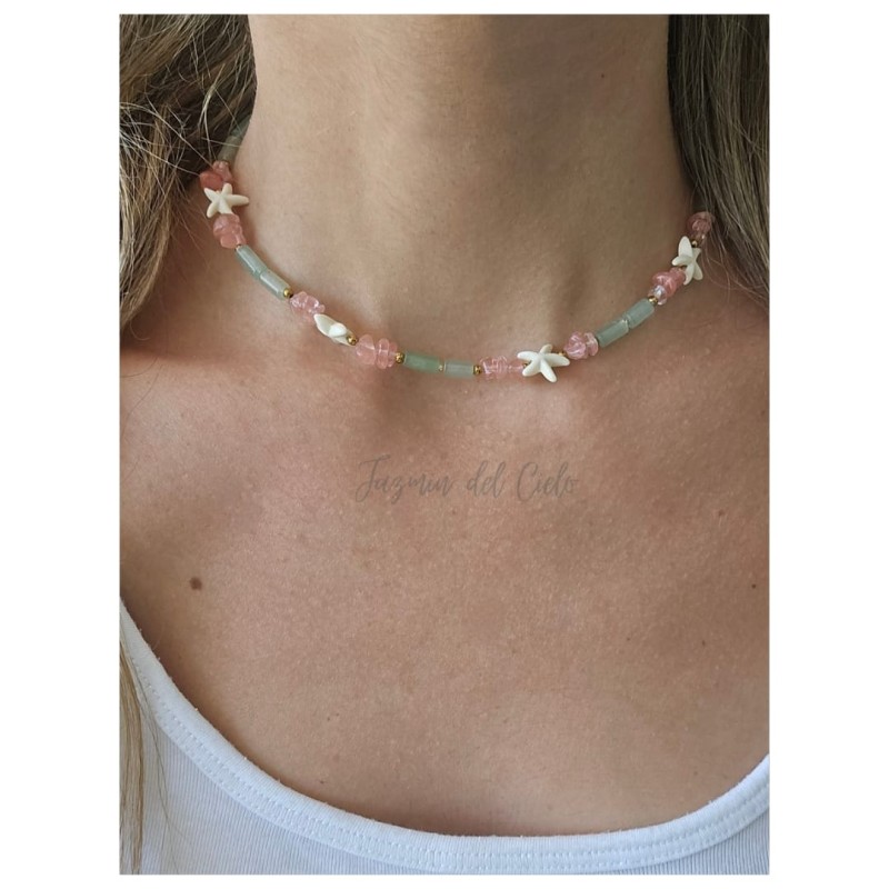Collar en distintas piedras naturales en Aventurina y Calcedonia rosa, combinando texturas y formas con separadores dorados en acero inoxidable y estrellas de Mar natural, haciendo así un collar veraniego.