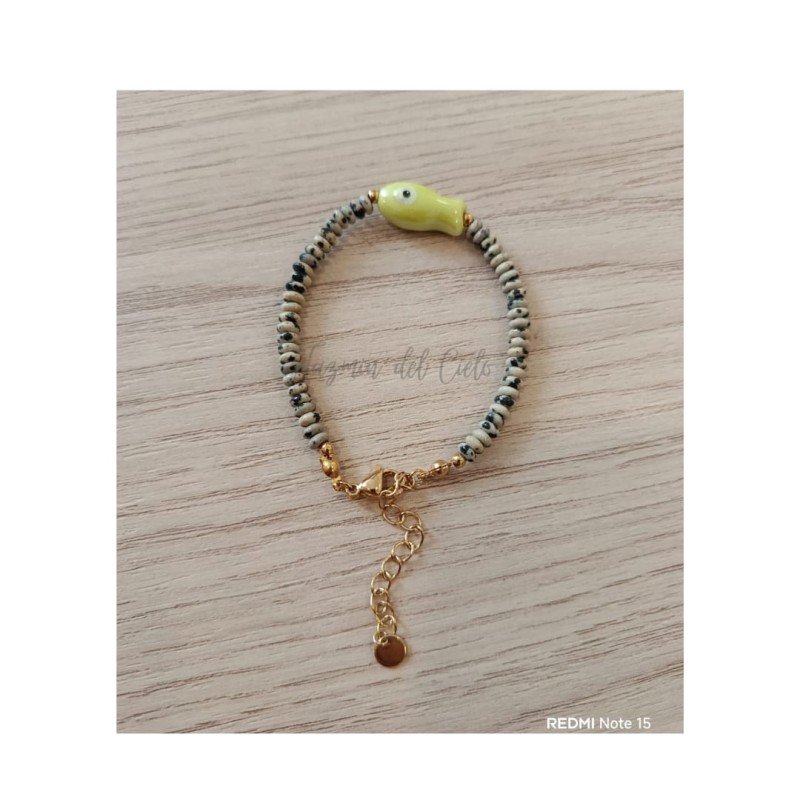 Pulsera en piedras naturales dálmata con dije de pez en cerámica color verde limón