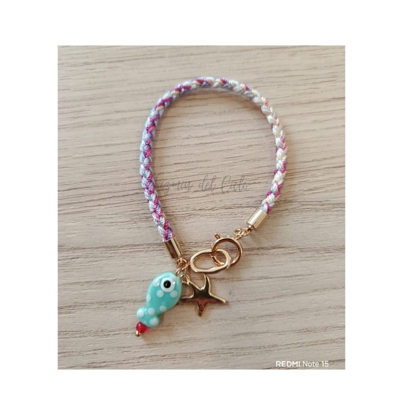 Pulsera en cuerda trenzada en tonos fucsia,lila, lavanda y blanco con doble dije.