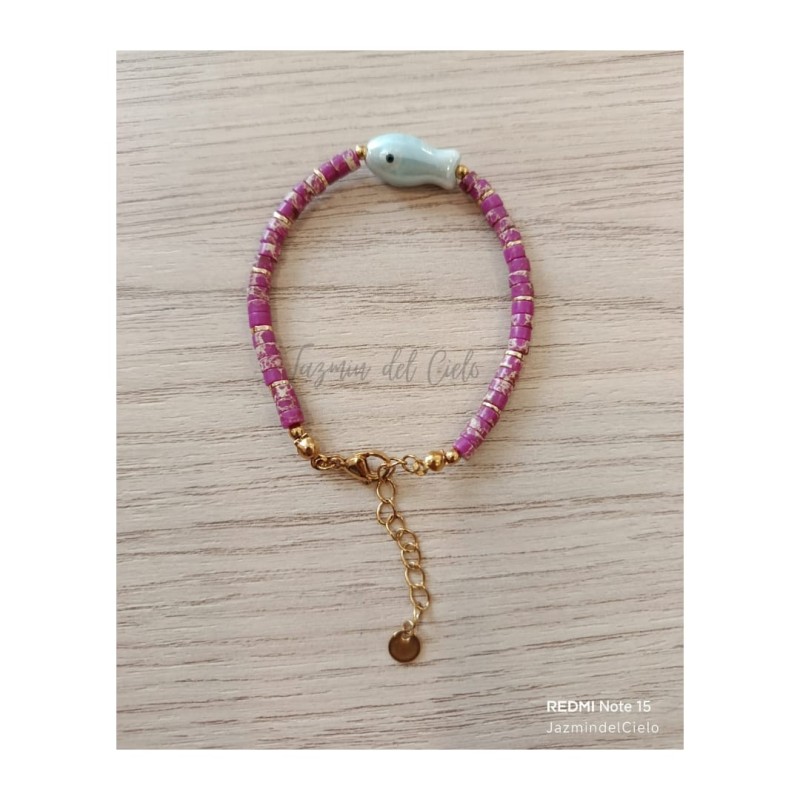 Pulsera en piedras naturales planas de Jaspe lila con separadores dorados en acero inoxidable y un dije central en forma de pez en cerámica celeste.