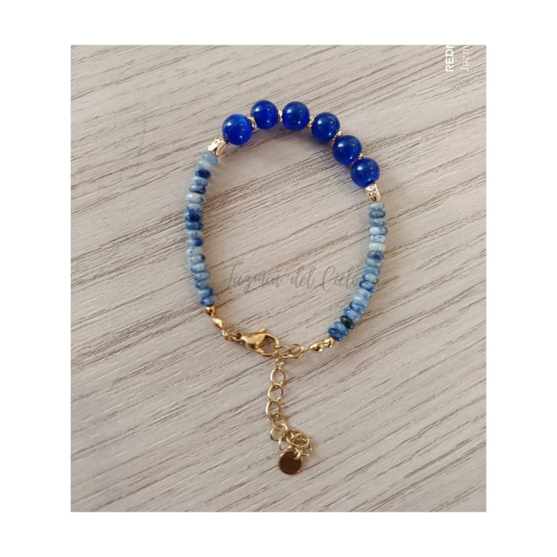 Pulsera en piedras naturales combinadas de Sodalitas y Calcedonia con separadores dorados en acero inoxidable.