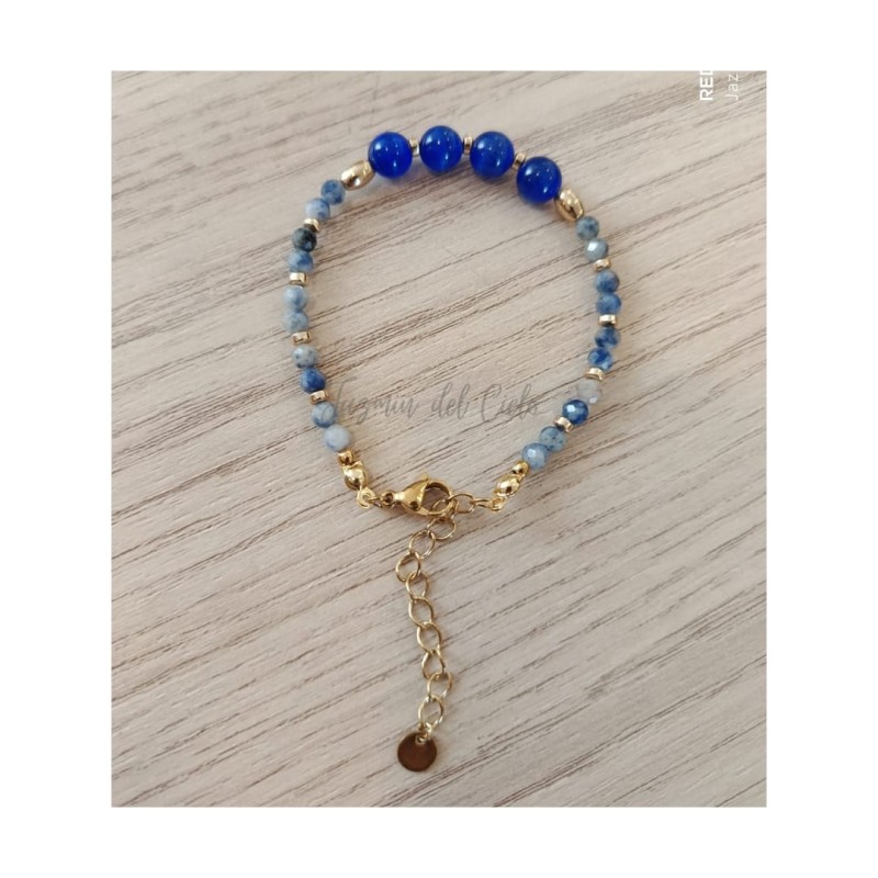 Pulsera en piedras naturales combinadas de Sodalitas y Calcedonia azul con separadores dorados en acero inoxidable.