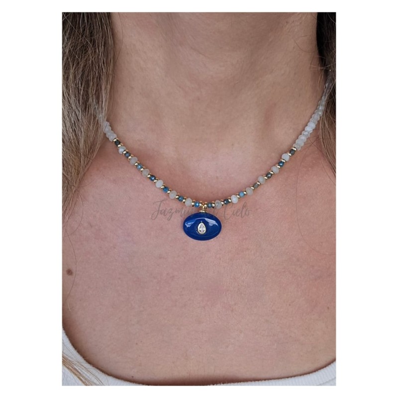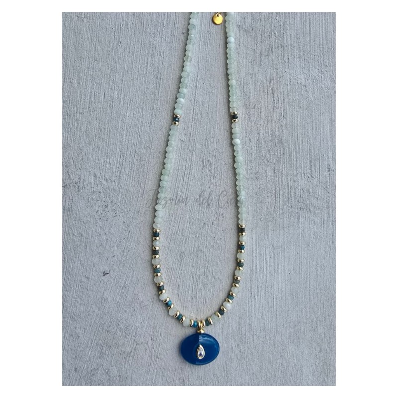 Collar en piedras naturales de Calcedonia aqua combinados con piedras naturales de Agatas turquesa con separadores dorados en Goldfield con un dije central en piedra natural azul fran ia con un pequeño circón.