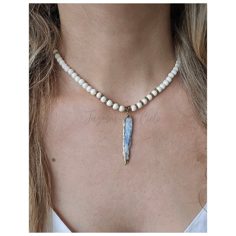 Collar en piedras naturales de Turquesa blanca con separadores en Hematitas y un dije central de cianita.