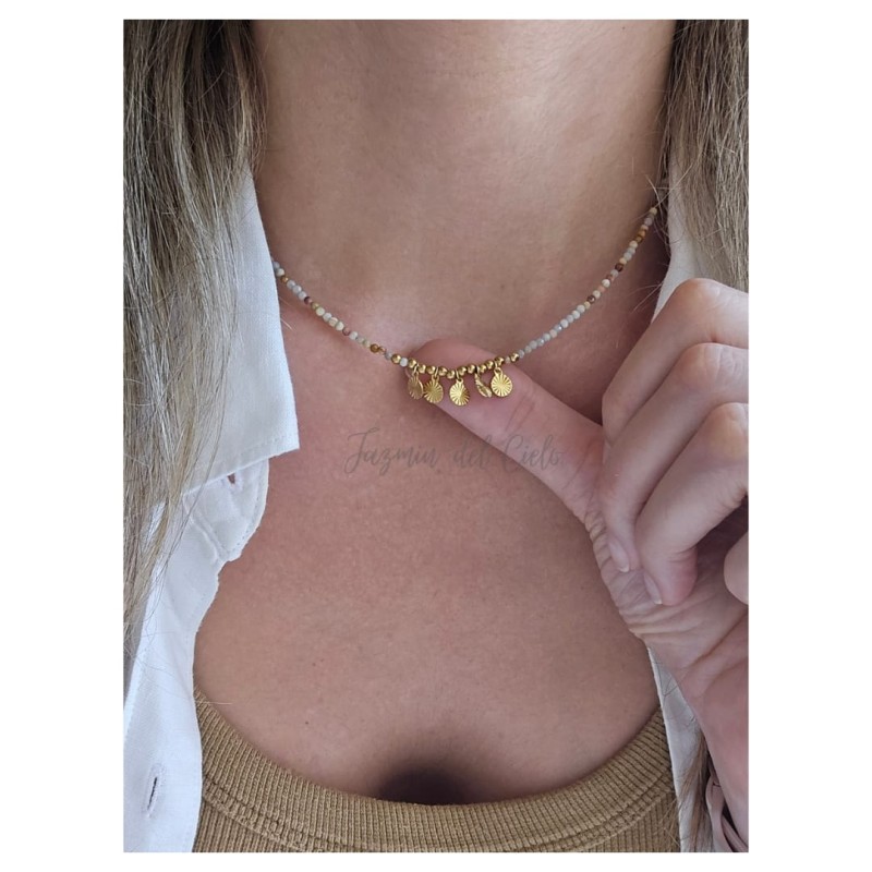 Collar en micro piedras naturales tonos tierra de Jaspe con separadores centrales y mini dijes redondos en acero inoxidable dorados.