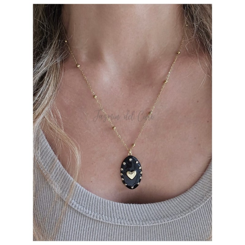 Collar en cadena con pelotitas de acero inoxidable con un dije grande en forma ovalada de acero inoxidable y esmaltado negro con un corazón dorado central.