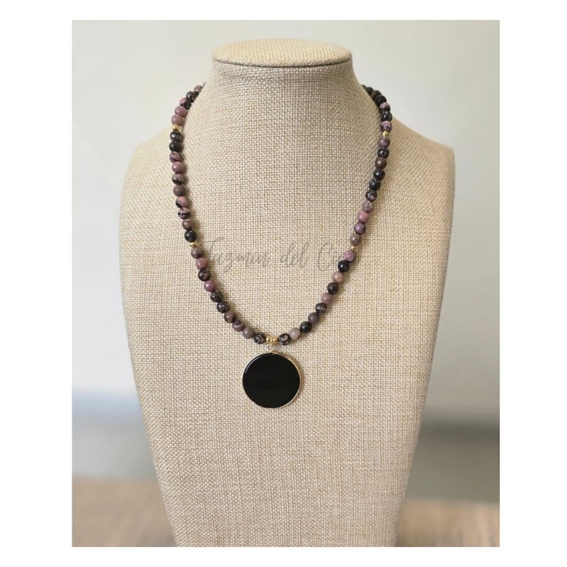 Collar de piedras varias (Rodonita, Agata y Cuarzo rutilado) con separadores de acero inoxidable y dijes de Obsidiana de forma circular.