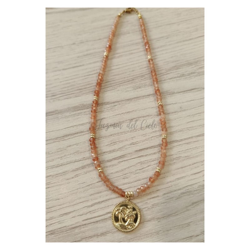 Collar en piedras naturales de Calcedonia color naranja con separadores dorados en Goldfield y un dije central redondo con diseño interior de palmeras dorado en acero inoxidable.