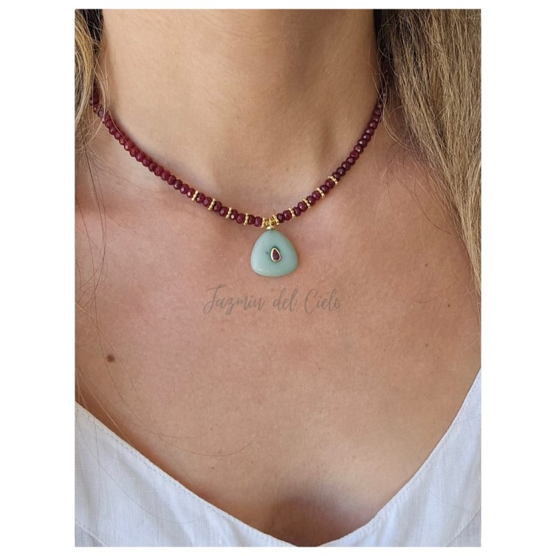 Collar en piedras naturales de Calcedonia bordó con separadores dorados en acero inoxidable en forma de margaritas y un dije central en forma de triángulo en piedra natural verde con un circón bordo en el centro.