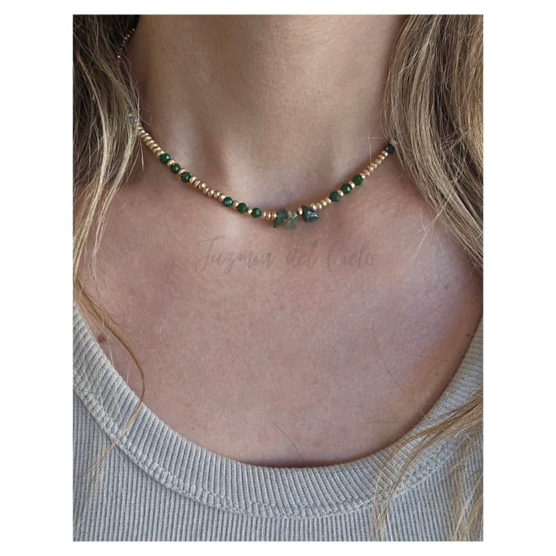 Collar en piedra facetada de hematita mate con cristales en tono verde oscuro y piedras naturales irregulares en el centro del collar al tono.
