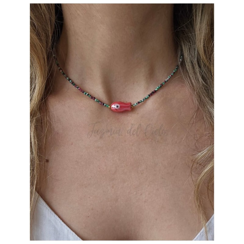 Collar en piedras naturales facetadas con un dije central en cerámica con forma de pez rojo.