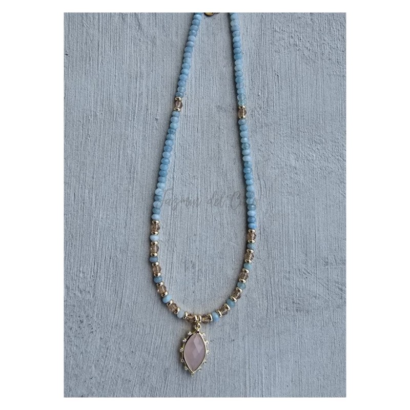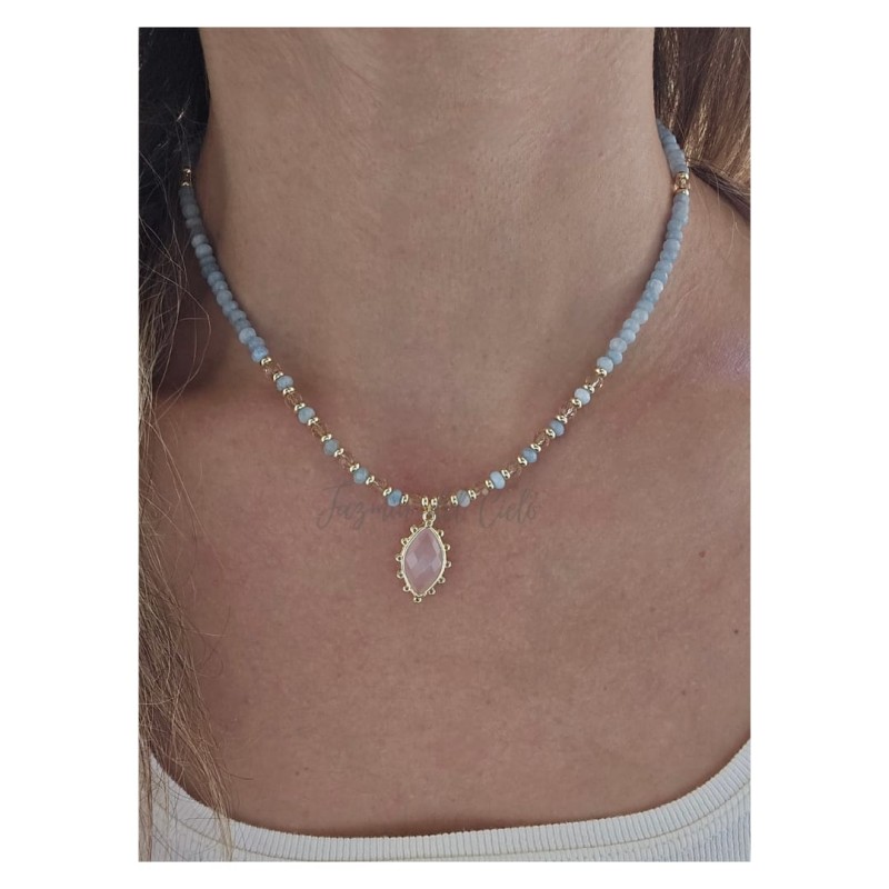 Collar en piedras naturales de Agatas celestes combinados con cristales rosados aguados y separadores dorados en Goldfield con un dije central en forma ovalada con piedra de cuarzo rosa y puntitos.