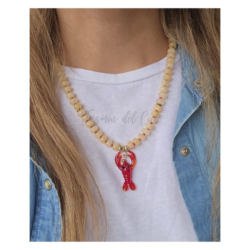 Collar en piedra Rodelle de Jade Amarillo Natural con separadores rojos y Goldfield con dije central en forma de langosta roja.