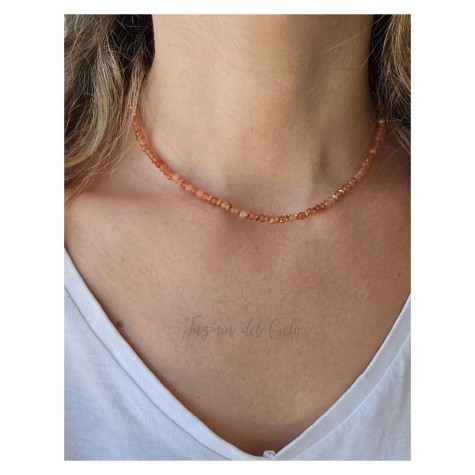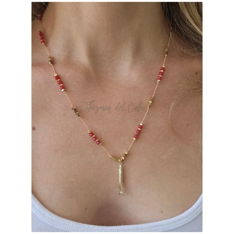Collar artesanal con cuentas de cerámica pintadas a mano, donde cada pieza es una pequeña obra de arte. Intercaladas con pequeñas cuentas color coral y dorado, el conjunto crea una composición rica y equilibrada.