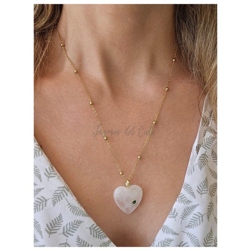 Collar en cadena dorada de acero inoxidable con pelotitas y un corazón de Cuarzo cristal blanco con un pequeño circón verde .