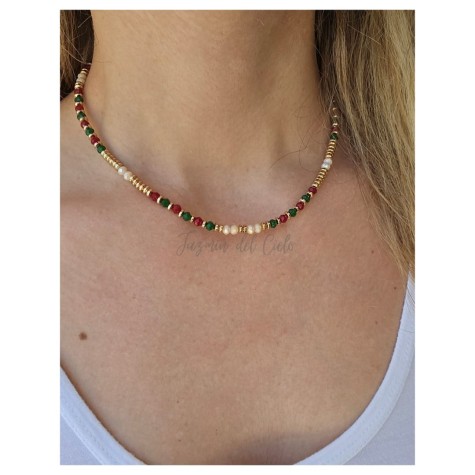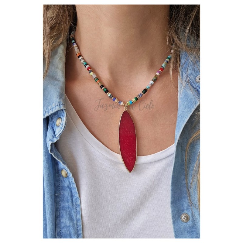 Collar en mix de piedras naturales con separadores dorados en acero inoxidable con un dije central en forma de hoja en piedra de cristal roja.