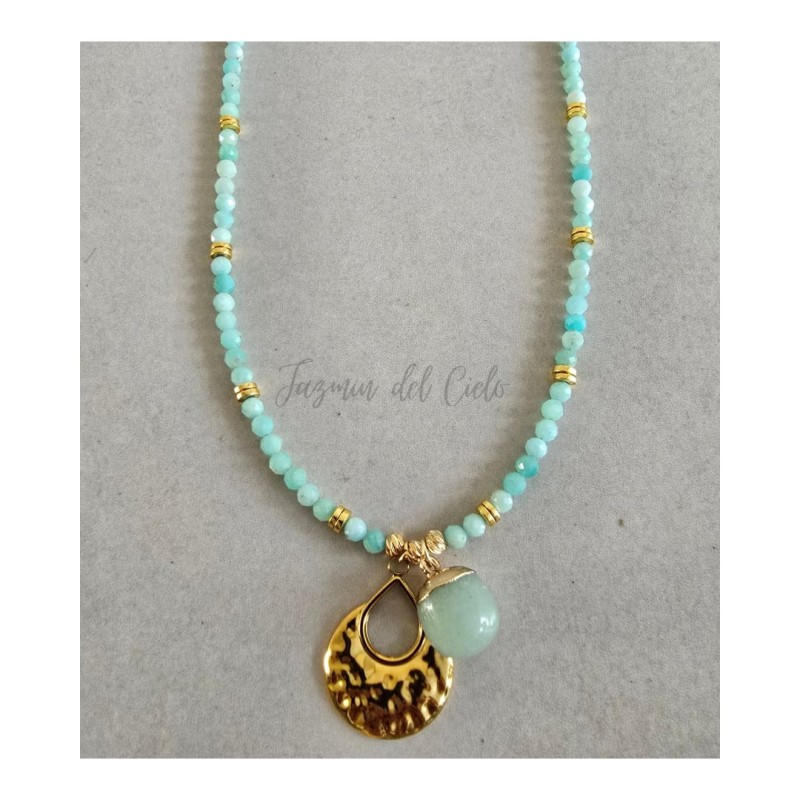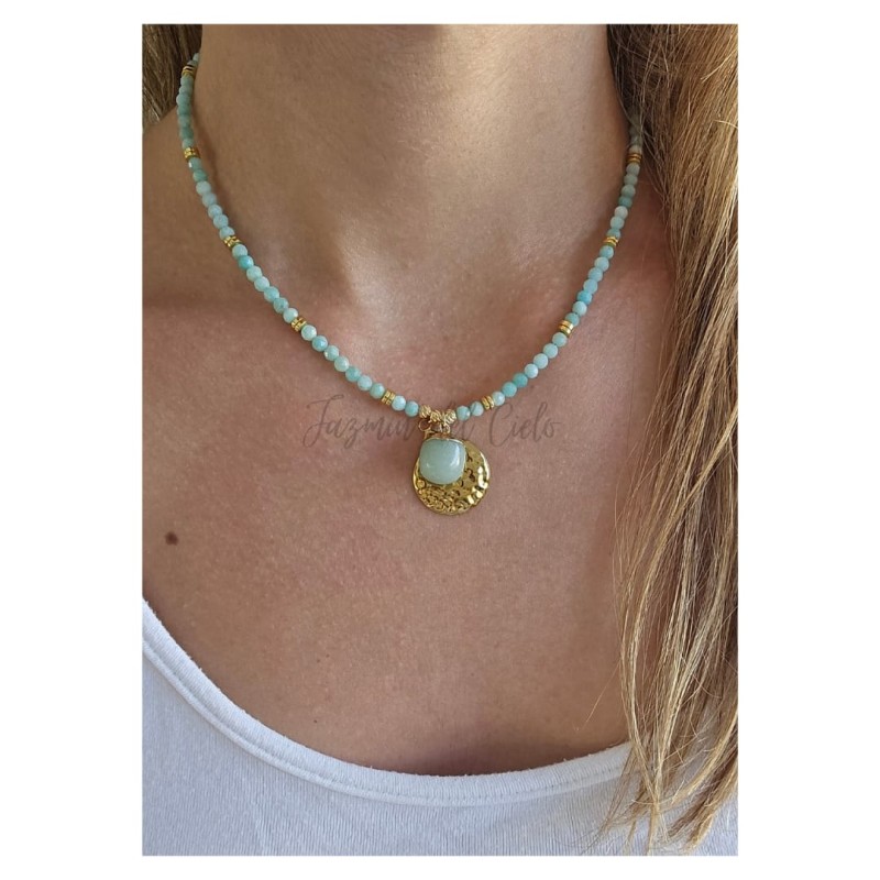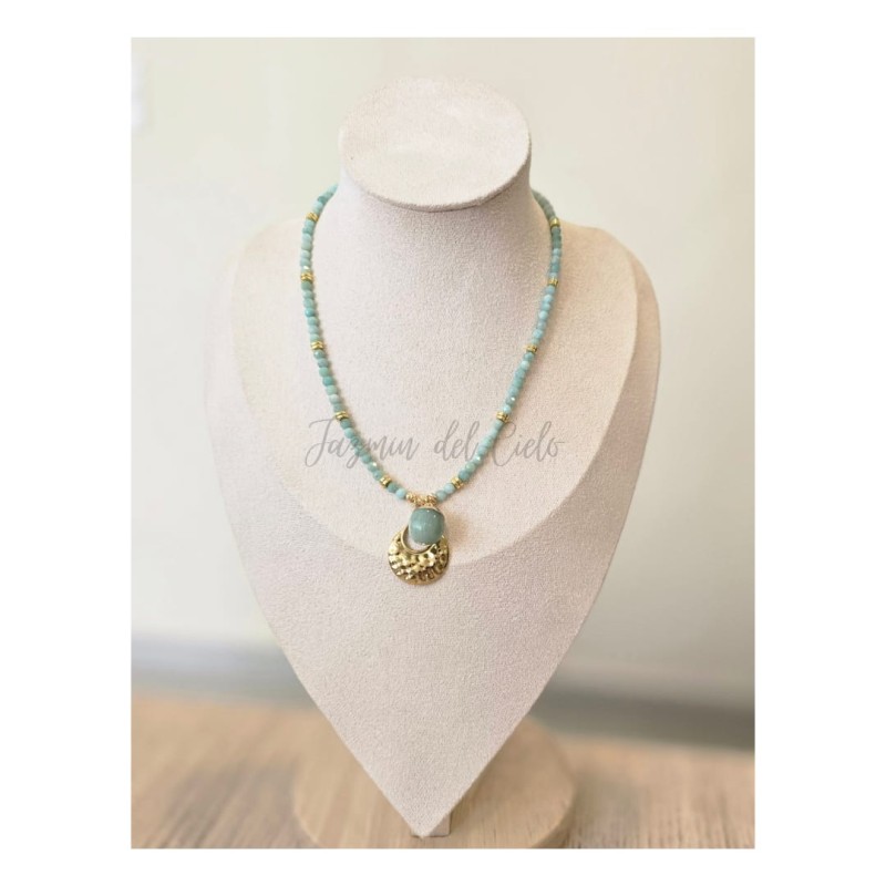 Collar vibrante compuesto por pequeñas cuentas de Amazonita en colores Rojo, Turquesa y Aguamarina. Cada collar está realzado con separadores Goldfield. En el centro, un dije dorado de acero inoxidable y otro de piedra natural al tono.