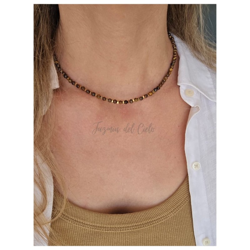 Collar de piedras naturales de Ojo de tigre con separadores en Hematitas doradas.