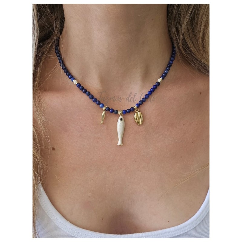 Collar de piedras naturales Lapislázuli con toques en piedras naturales de Turquesa blanca con separadores dorados en acero inoxidable y tripli dije, 2 en acero inoxidable y un central en forma de pez nacarado .