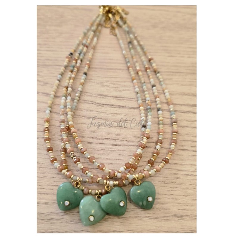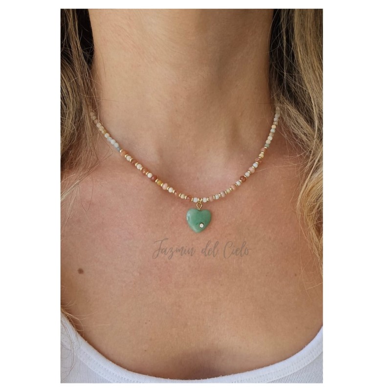 Collar de piedras naturales de Amazonita combinadas con piedras naturales de Jaspe con separadores dorados en Goldfield y un dije central en forma de corazón en Aventurina.