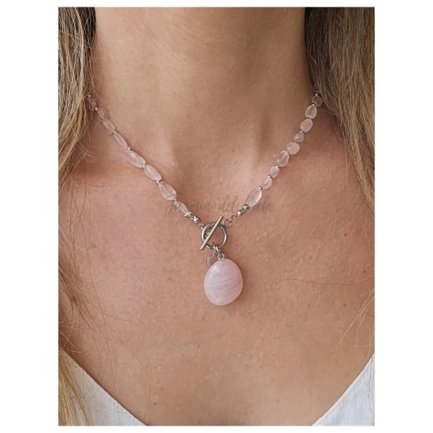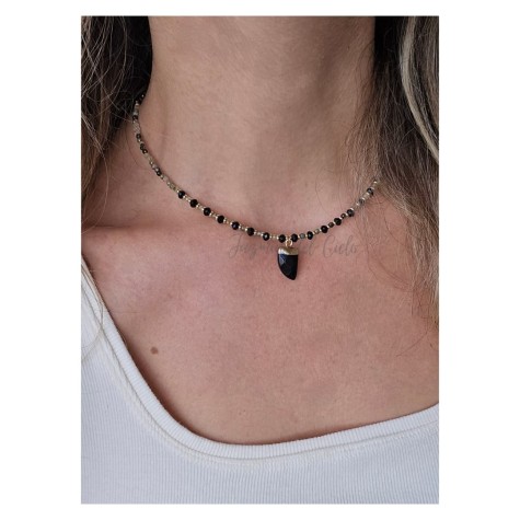 Collar de hilo atado con piedras naturales de Turmalina y cristales con dije de Obsidiana Negra en forma de hoja.