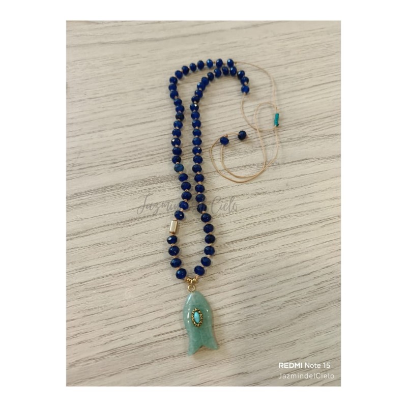 Collar ajustable en hilo atado color marrón con cristales azules, con un separador dorado en acero inoxidable y dije en forma de pez en piedra natural de Aventurina.