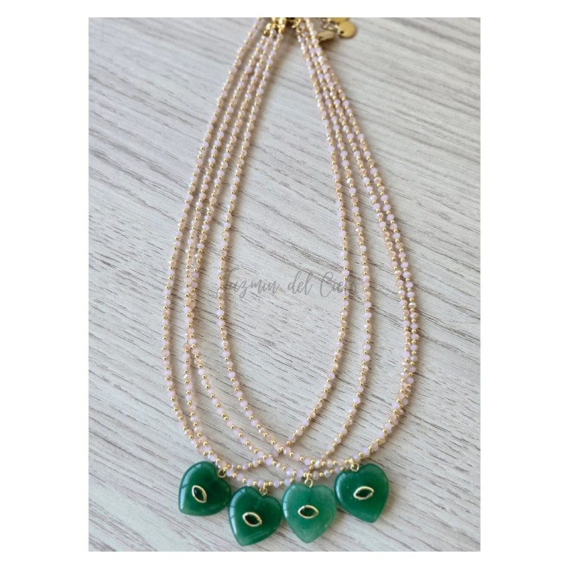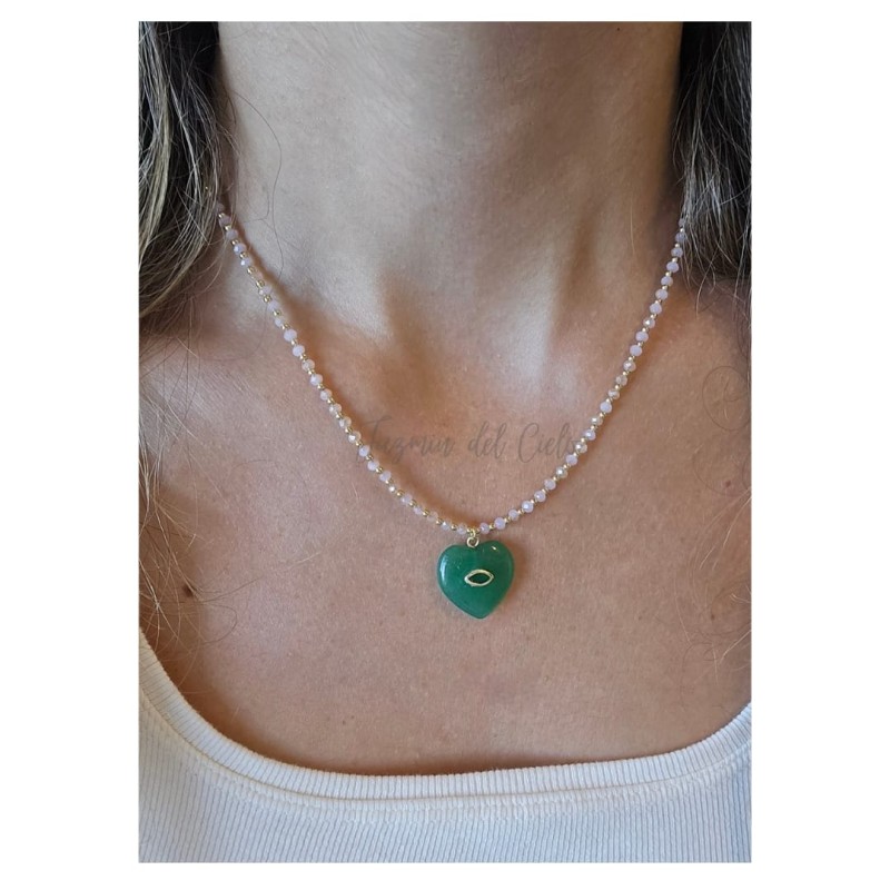Collar de cristales matizados salmón con separadores dorados Goldfield y un dije central en forma de corazón de piedra natural de Aventurina.