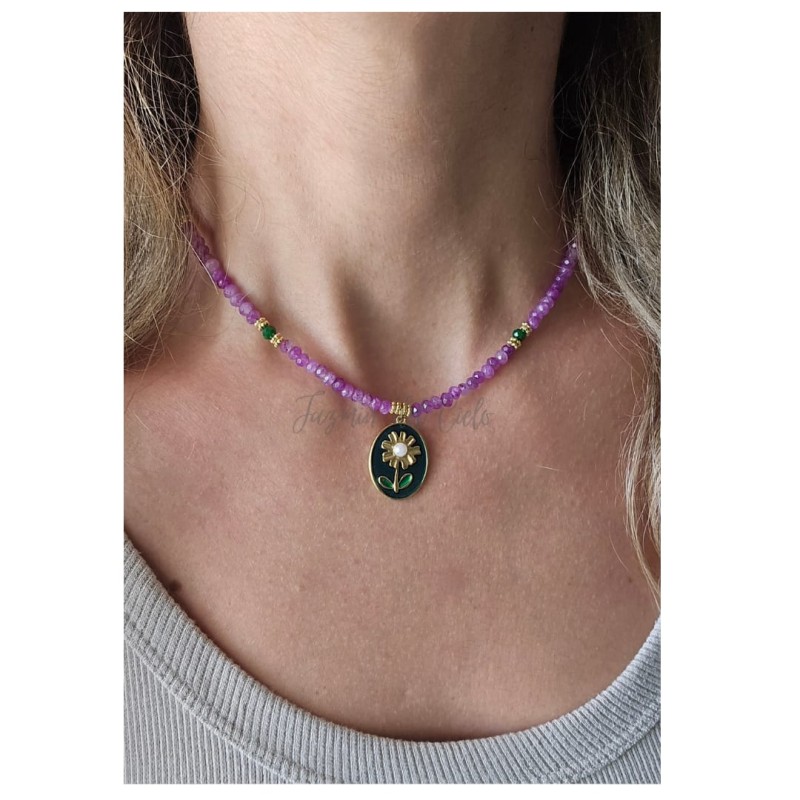Collar en piedras naturales de Calcedonia lila combinado con cristales verdes y separadores dorados en acero inoxidable y un dije central en forma de óvalo esmaltado verde con una flor en el medio.