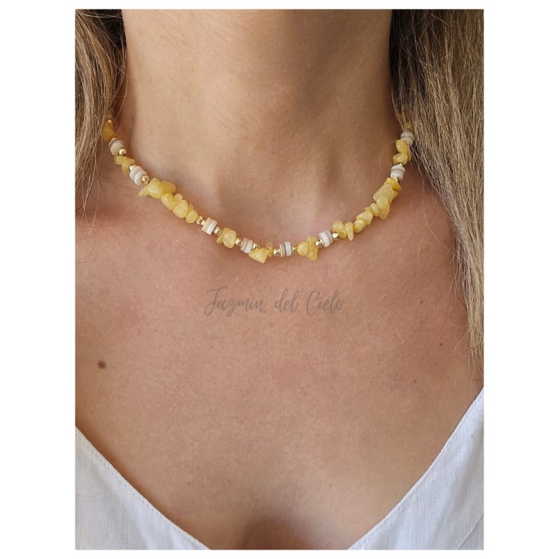 Collar en piedras naturales irregulares color amarillo combinados con piedras de Nacar matizado y separadores dorados en Goldfield.
