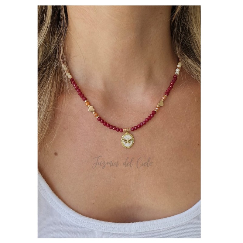 Collar de cristales facetados en tono bordó combinado con cristales facetados natural y terracota con separadores dorados y mini dijes de corazones de acero inoxidable y un dije central ovalado en acero inoxidable con esmaltado y una mariposa en el centro.