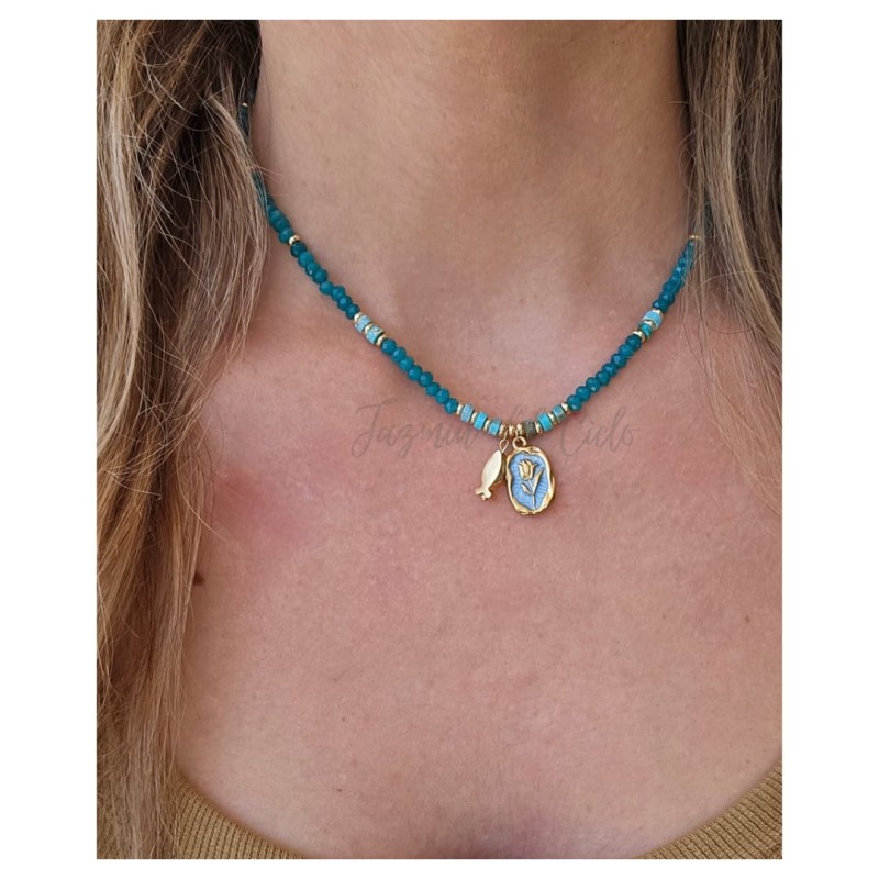 Collar en piedras naturales de agatas en tono turquesa con separadores en Goldfield combinados con piedras naturales planas celestes y doble dije,uno en forma de pez en acero inoxidable y un dije central en acero inoxidable y esmaltado celeste.