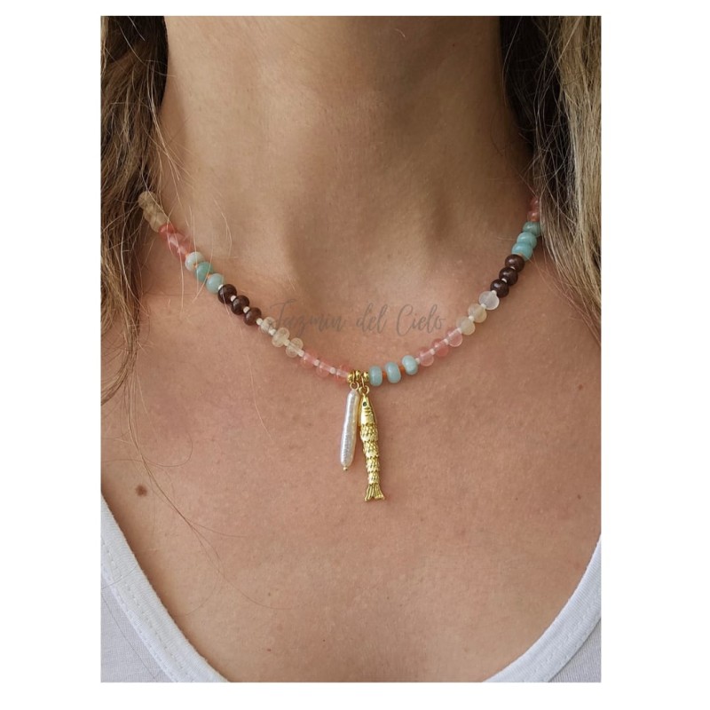 Collar en piedras naturales Rondelle en Agatas y cuarzo rosa con separadores en mostacillitas blancas y dos dijes centrales, un dije de perla de rio rectangular y un pez articulado de acero inoxidable.